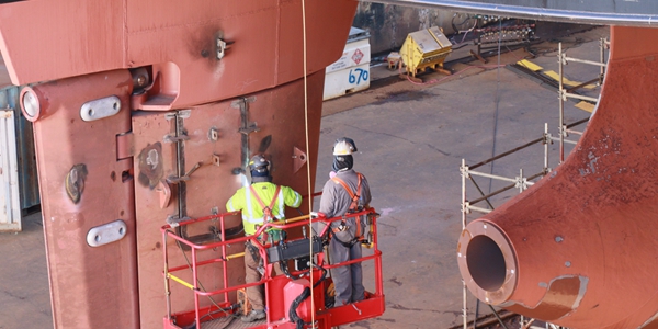 | ▲ 노동자가 2025년 12월22일 미국 필라델피아 한화필리조선소 건조시설(도크)에서 선체 하부에 용접 작업을 하고 있다. <연합뉴스> |