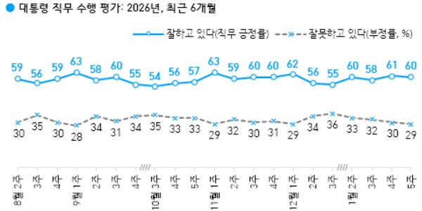 이재명 대통령 직무수행 평가에서 '잘하고 있다'는 60%, '잘못하고 있다'는 29%로 집계됐다. '의견 유보'는 11%였다.