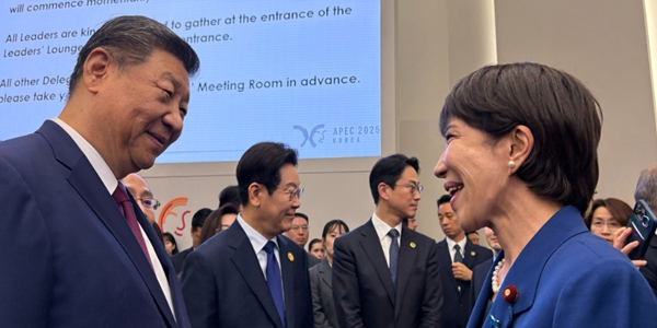 ▲ 다카이치 사나에 일본 총리(오른쪽)와 시진핑 중국 국가주석이 2025년 10월31일 경주 APEC 정상회담장에서 인사를 나누고 있다. <사나에 총리 X 사진 갈무리>
