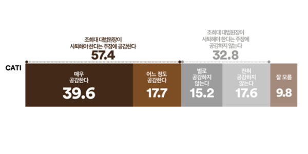 여론조사꽃이 9일 발표한 여론조사에서 사법 신뢰를 회복하기 위해 조희대 대법원장이 사퇴해야 한다는 주장에 대한 의견을 물은 결과 ‘공감한다’ 57.4%(매우 공감한다 39.6% 어느 정도 공감한다 17.7%), ‘공감하지 않는다’ 32.8%(별로 공감하지 않는다 15.2% 전혀 공감하지 않는다 17.6%)로 집계됐다. ‘모름·무응답’은 9.8%였다.