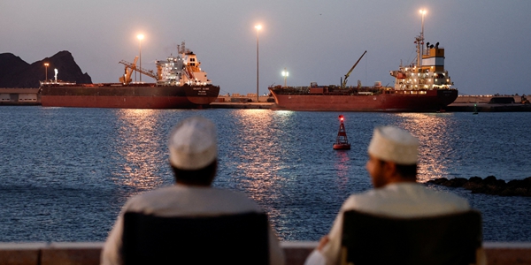 ▲ 의자에 앉은 두 사람이 9일 오만 무스카트항 인근 해상에 정박한 벌크선과 유조선을 바라보고 있다. 무스카트항은 <연합뉴스>