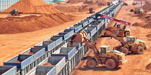 ▲ 트랙터가 9일 중국 산둥성 옌타이항으로 들어온 수입산 보크사이트 광석을 알루미늄 공장행 열차 짐칸에 퍼나르고 있다. <연합뉴스>