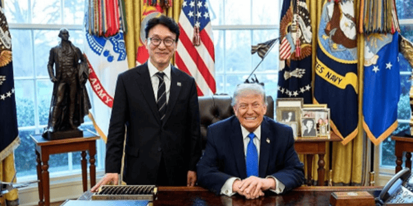 ▲ 김민석 국무총리가 13일(현지시각) 미국 워싱턴DC 백악관에서 도널드 트럼프 미국 대통령을 만나 기념사진을 찍고 있다. <총리실>
