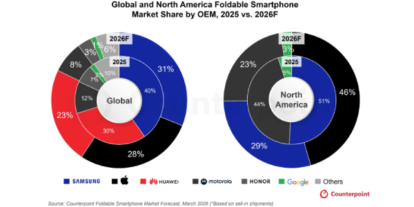 ▲ 글로벌과 북미 폴더블 스마트폰 제조사별 시장점유율(2025년 vs 2026년 전망). <카운터포인트리서치>