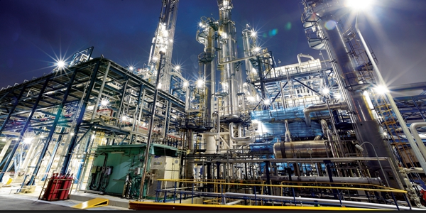 | ▲ 말레이시아에 위치한 롯데케미칼타이탄의 석유화학 공장에서 야간에 조명이 빛나고 있다. <롯데케미칼타이탄> |