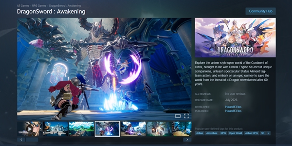 | ▲ 웹젠이 21일 개발사 하운드13의 '드래곤소드' 스팀 서비스 출시 준비에 대해 법원에 금지 가처분을 신청했다고 밝혔다. 사진은 하운드13이 출시를 준비하는 게임 '드래곤소드'의 스팀 페이지. <스팀> |