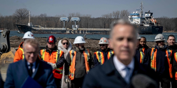 ▲ 작업용 조끼를 입은 노동자들이 9일 캐나다 퀘백주 콩트르쿠르에서 마크 카니 총리의 몬트리올 항구 확장 계획을 듣고 있다. <연합뉴스>