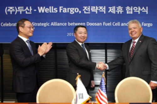 | ▲ 박정원 두산그룹 회장(가운데)이 6월28일 미국 워싱턴D.C 파크하얏트 호텔에서 열린 미국 웰스파고 은행과의 연료전지 판매를 위한 전략적제휴 협약식에서 기념촬영을 하고 있다. |