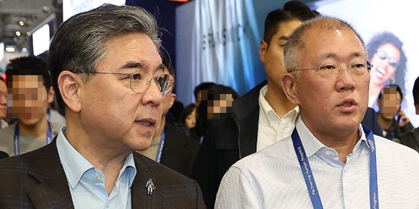 ▲ 현대차그룹이 최근 비공개 연례행사 글로벌리더스포럼을 처음 미국에서 진행했다. 사진은 정의선 현대차그룹 회장(오른쪽)과 장재훈 현대차그룹 부회장이 현지시각 6일 미국 네바다주 라스베이거스에서 열린 가전·IT 전시회 ‘CES 2026’ 현장을 방문한 모습. <연합뉴스>