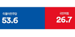 여론조사꽃이 26일 발표한 정당지지도 조사 결과 더불어민주당 53.6%, 국민의힘 26.7%로 집계됐다.