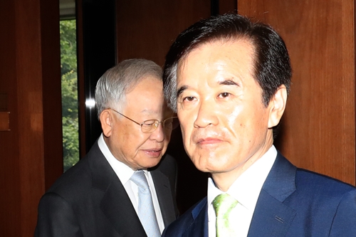 ▲ 손경식 경총 회장(왼쪽)과 송영중 경총 상임부회장이 6월15일 서울 중구 서울클럽에서 열린 경총 회장단 회의에 참석하고 있다. <연합뉴스>