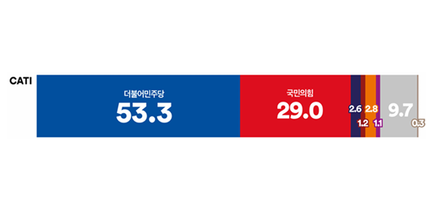 여론조사꽃이 13일 발표한 정당지지도 조사 결과 더불어민주당 53.3%, 국민의힘 29.0%로 집계됐다.