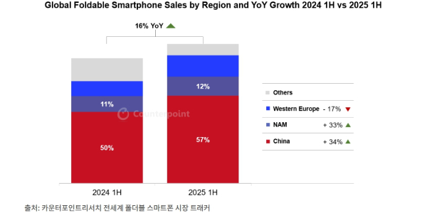 [비즈니스포스트] 2025년 상반기 전 세계 폴더블폰 시장이 16% 성장한 가운데, 중국 폴더블 시장의 성장세가 두드러진 것으로 나타났다.