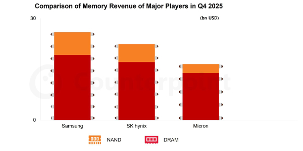 | ▲ 2025년 4분기 주요 업체의 메모리 매출액 비교(10억 달러). <카운터포인트리서치> |