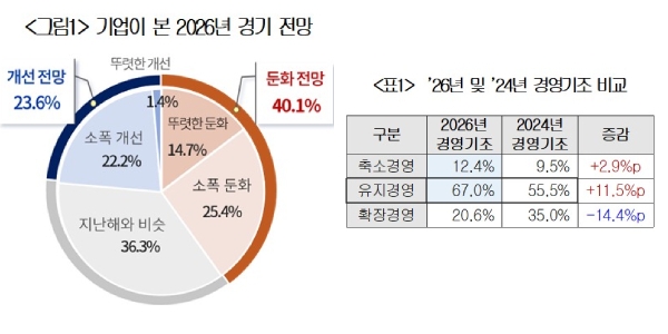 | ▲ 기업이 본 2026년 경기 전망(왼쪽)과 2026년/2024년 경영기조 변화 비교. <대한상공회의소> |