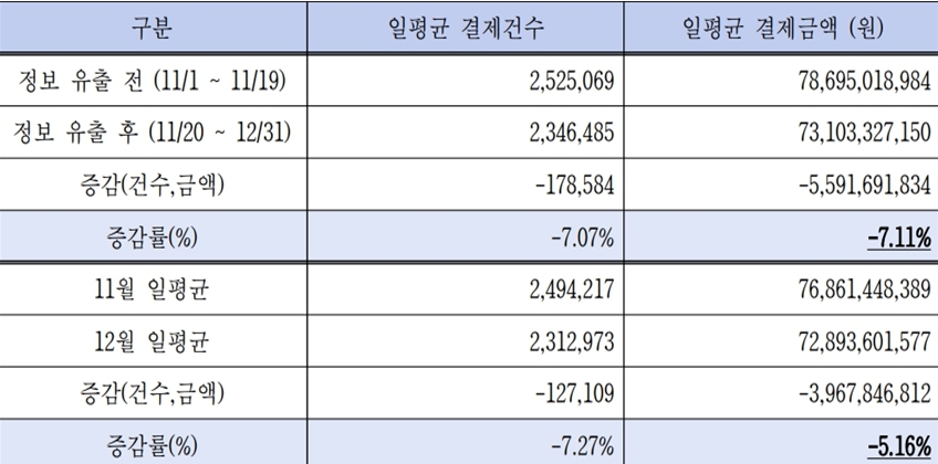 이는 개인정보 유출이 알려지기 전인 11월 1일~19일 일평균 결제액(786억9502만 원)과 비교해 7.11% 감소한 수치다. 쿠팡의 대규모 개인정보 유출 사태는 쿠팡이 지난해 11월20일 개인정보보호위원회에 신고하면서 외부로 알려졌다.