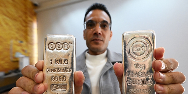 ▲ 한 점원이 12일 쿠웨이트 수도에 위치한 보석상에서 순도 999.0짜리 실버바를 두 손에 들고 있다. <연합뉴스>