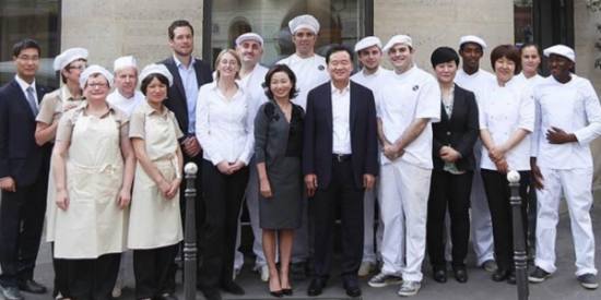 ▲ 파리바게뜨 내부 사정에 정통한 한 관계자에 따르면 허영인 SPC그룹 회장(가운데 오른쪽)의 아내 이미향씨(가운데 왼쪽)이 파리바게뜨 신제품 출시에 직접 조언을 하는 것으로 알려졌다. 사진은 2014년 7월 파리바게뜨 프랑스 1호점 파리 샤틀레점에서 기념사진을 찍는 모습. <파리바게뜨>