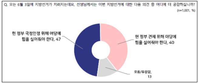 엠브레인퍼블릭·케이스탯리서치·코리아리서치·한국리서치가 22일 발표한 전국지표조사(NBS)에서 '현 정부의 국정안정을 위해 여당에 힘을 실어줘야 한다'(여당) 47%, '현 정부를 견제하기 위해 야당에 힘을 실어줘야 한다'(야당) 40%로 집계됐다. '모름·무응답'은 13%였다.