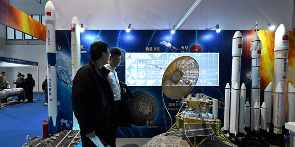 ▲ 관람객이 23일 중국 베이징에서 열린 국제 상업우주박람회장에서 로켓 모형을 구경하고 있다. <연합뉴스>