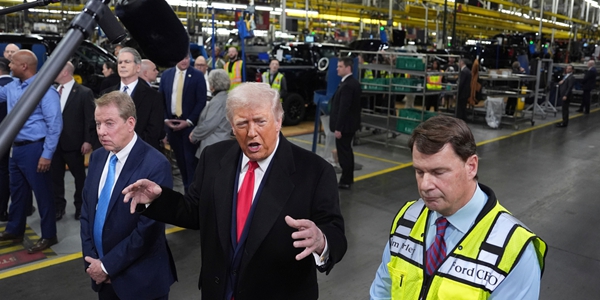 | ▲ 짐 팔리 포드 CEO(오른쪽)이 1월13일 미국 미시간주 디어본에 위치한 리버루즈 자동차 공장에서 도널드 트럼프 대통령(가운데)의 이야기를 듣고 있다. <연합뉴스> |