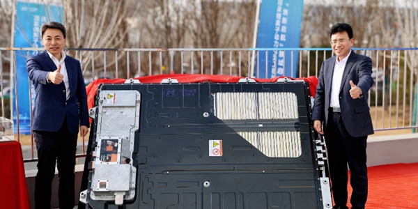 | ▲ 중국 제일자동차그룹의 배터리 연구원이 중국 지린성 창춘시에서 열린 콘퍼런스에서 반고체 배터리를 전시하고 있다. <제일자동차그룹> |
