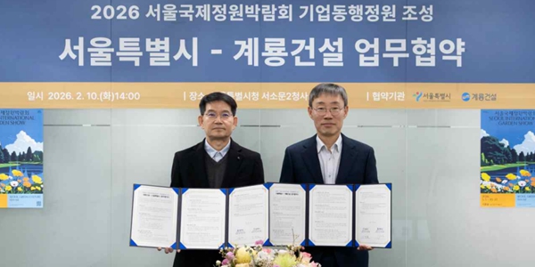 | ▲ 서동욱 계룡건설 상무(왼쪽)와 김영환 서울시 정원도시국장이 지난 10일 서울시 청사에서 협약을 맺고 기념사진을 찍고 있다. <서울시> |
