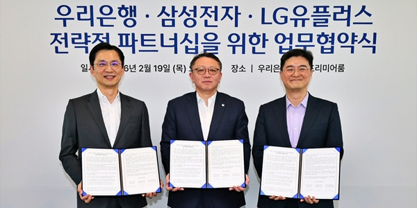 우리은행은 19일 서울 중구 본점에서 삼성전자, LG유플러스와 함께 ‘1020 미래세대 고객 유치를 위한 공동 마케팅 업무협약’을 맺었다고 20일 밝혔다.