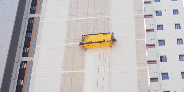 | ▲ 현대엔지니어링이 시공 중인 아파트 현장에서 외벽도장로봇 시연이 진행되고 있다. <현대엔지니어링> |