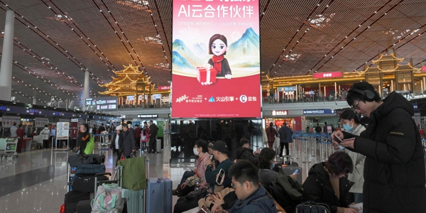 | ▲ 바이트댄스의 인공지능 플랫폼 광고 아래에서 대기하고 있는 여행객이 5일 중국 베이징 서우두국제공항에서 스마트폰을 사용하고 있다. <연합뉴스> |