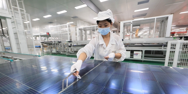 | ▲ 중국 장쑤성에 위치한 한 태양광 모듈 공장에서 노동자가 제품을 검수하고 있다. <연합뉴스> |