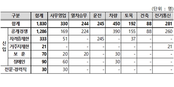 [비즈니스포스트] 한국철도공사(코레일)가 올해 상반기 1830명을 새롭게 채용한다.