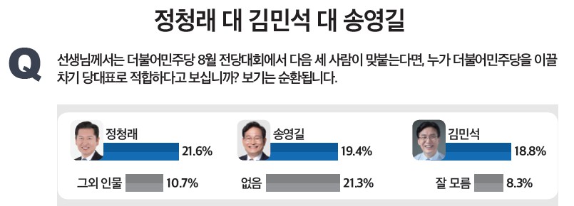 미디어토마토가 26일 발표한 여론조사에서 민주당 8월 전당대회에서 정 대표와 송 대표, 김 총리가 맞붙는다면 누가 차기 당 대표로 적합하다고 보는지를 물은 결과 '