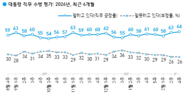 이재명 대통령 직무수행 평가에서 '잘하고 있다'는 64%, '잘못하고 있다'는 26%로 집계됐다. '의견 유보'는 10%였다.