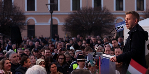 | ▲ 연단에 오른 페테르 마자르 헝가리 티서당 대표가 25일 발라사야르마트에서 진행한 선거 유세에서 연설하고 있다. <연합뉴스> |