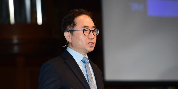 | ▲ 장덕현 삼성전기 대표이사 사장이 18일 서울 양재동 엘타워에서 열린 제53기 정기 주주총회에서 주주들에게 회사의 경영 상황과 중점 추진 방향을 설명하고 있다. <삼성전기> |