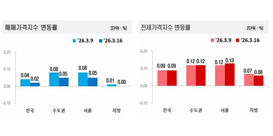 | ▲ 3월 셋째주 매매가격 및 전세가격지수 변동률. <한국부동산원> |