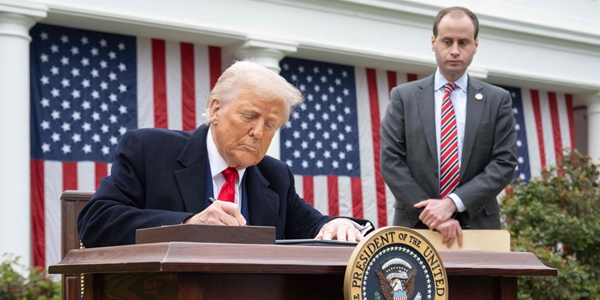 ▲ 도널드 트럼프 미국 대통령이 2일 워싱턴D.C. 백악관 로즈가든에서 열린 행사에서 행정명령에 서명하고 있다. <연합뉴스>
