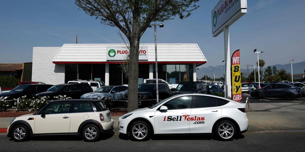 ▲ '테슬라 차량을 판매합니다'고 좌측면에 스티커를 붙인 흰색 차량이 3월30일 미국 캘리포니아주 웨스트코비나에 위치한 중고차 딜러십에 주차돼 있다. <연합뉴스>