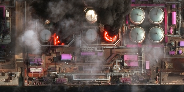 ▲ 러시아 우스트루가 항구에 위치한 석유 저장 탱크가 3월29일 화염과 검은 연기에 휩싸여 있다. <연합뉴스>