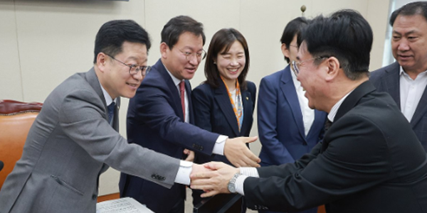 ▲ 기후에너지환경노동위원회 위원장인 안호영 더불어민주당 의원이 2일 국회에서 열린 상임위 전체회의를 마치고 김영훈 고용노동부 장관과 악수를 나누고 있다. <연합뉴스>