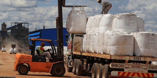 ▲ 노동자들이 2024년 1월9일 짐바브웨 고로몬지에 위치한 광산에서 지게차로 하얀색 자루에 담긴 리튬 정광을 트럭에서 실어내리고 있다. <연합뉴스>