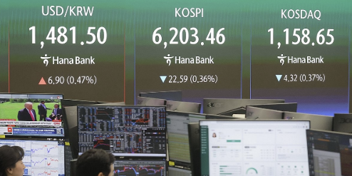 | ▲ 17일 오전 코스피가 장중 내리고 있다. 사진은 이날 오전 서울 중구 하나은행 딜링룸. <연합뉴스> |