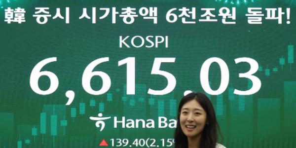 ▲ 코스피지수가 27일 사상 처음으로 6600선을 넘어섰다. 사진은 27일 장 마감 뒤 서울 중구 하나은행 딜링룸. <연합뉴스>