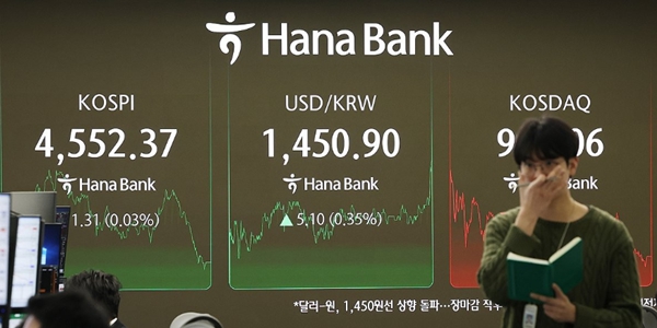 ▲ 8일 코스피가 4552.37로 장을 마쳤다. 사진은 이날 정규거래 마감 뒤 서울 중구 하나은행 딜링룸. <연합뉴스>