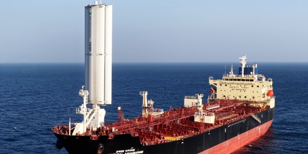 ▲ HMM이 국내 최초로 풍력보조추진장치 윙세이를 적용시킨 유조선 '오리엔탈 아쿠아마린호'가 지난 5일 출항했다. < HMM >