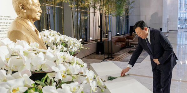 신 회장을 비롯해 임원진들은 일동 묵념을 했다. 이후 신 회장이 가장 먼저 흉상 앞에서 헌화를 한 뒤 임원진들도 차례로 헌화했다. 고정욱 사장과 노준형 사장, 이영준 사장에 이어 신유열 부사장이 다섯 번째로 헌화 후 묵념했다. 조성근 기자