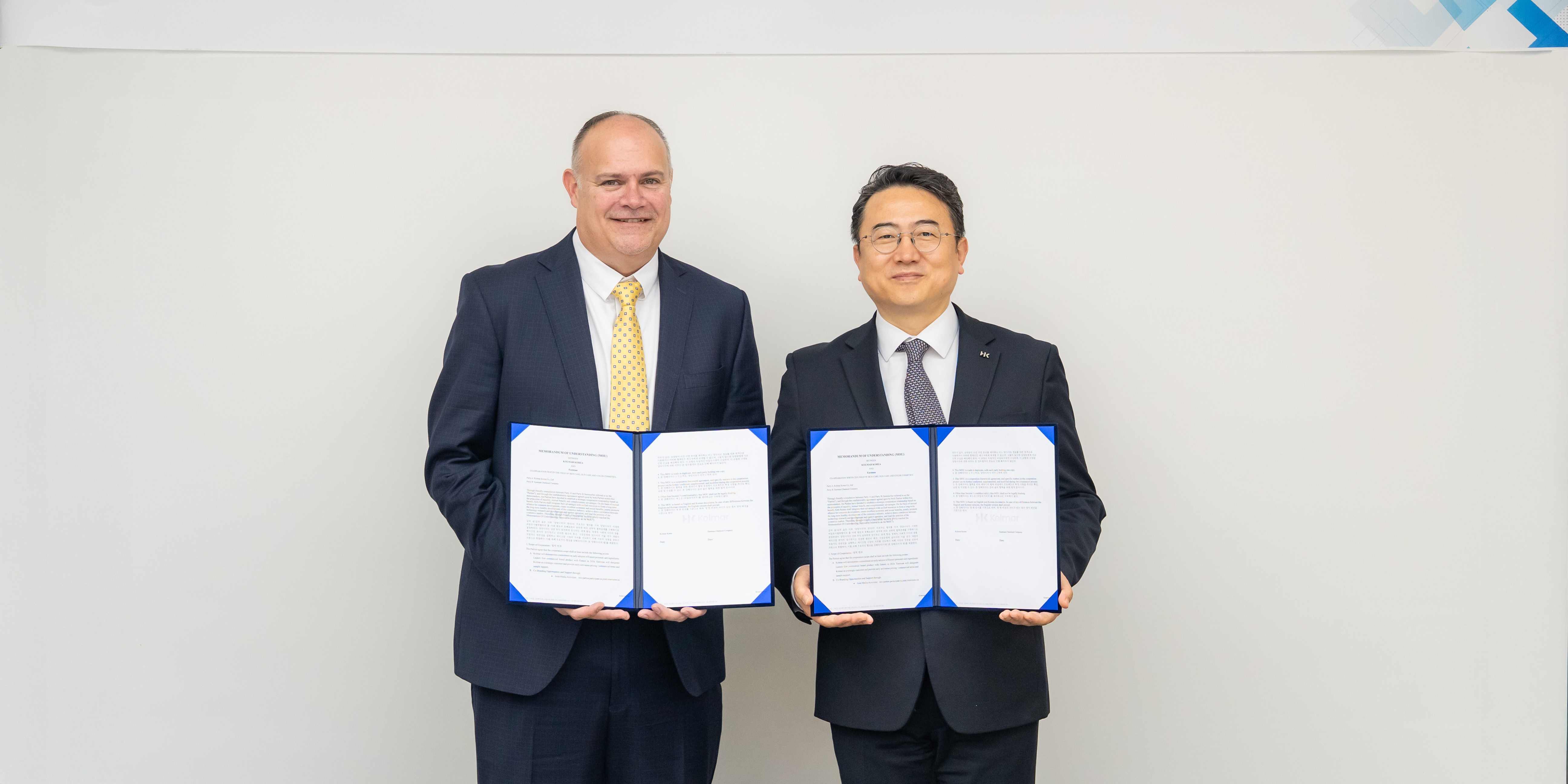 ▲ 16일 서울 서초구 소재 종합기술원에서 한상근 한국콜마 기술연구원 부사장(오른쪽)과 트래비스 스미스 이스트만 수석부사장이 업무협약을 기념하며 사진을 촬영하고 있다. <한국콜마>