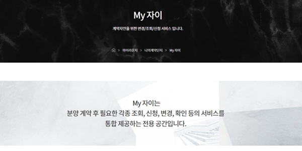 마이 자이는 자이 아파트 계약 고객을 대상으로 한 온라인 전용 서비스로 계약부터 잔금 완납까지 한 화면에서 관리하는 통합 플랫폼을 의미한다.