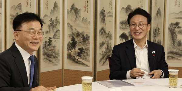▲ 김민석 국무총리가 20일 서울 종로구 삼청동 총리공관에서 박상진 산업은행 회장과 경제현안 관련 간담회를 하고 있다. <연합뉴스>